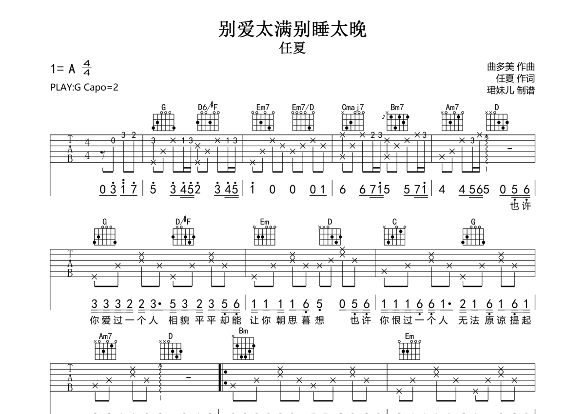 曲谱介绍: 任夏《别爱太满别睡太晚》吉他弹唱谱,采用G调指法编配,珺妹儿编配出品,共有2张高清图谱,免翻页排版设计。