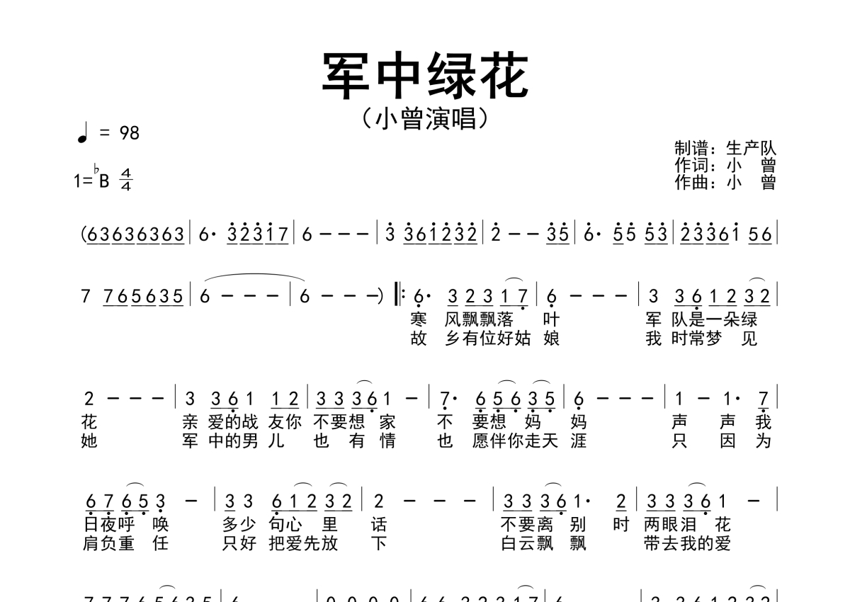 曲谱介绍: 小曾《军中绿花》,生产队编配出品,共有1张高清图谱,免翻页排版设计。