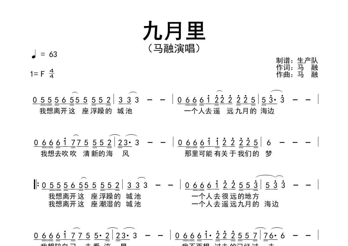 曲谱介绍: 马融《九月里》简谱,生产队编配出品,共有1张高清图谱,免翻页排版设计。