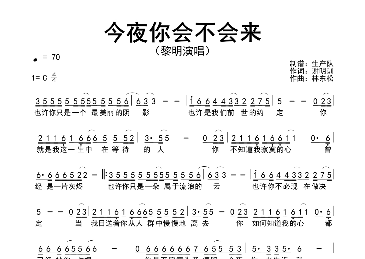 曲谱介绍: 黎明《今夜你会不会来》简谱,生产队编配出品,共有1张高清图谱,免翻页排版设计。