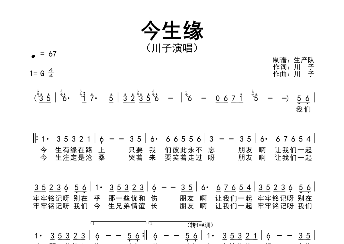 曲谱介绍: 川子《今生缘》简谱,生产队编配出品,共有1张高清图谱,免翻页排版设计。