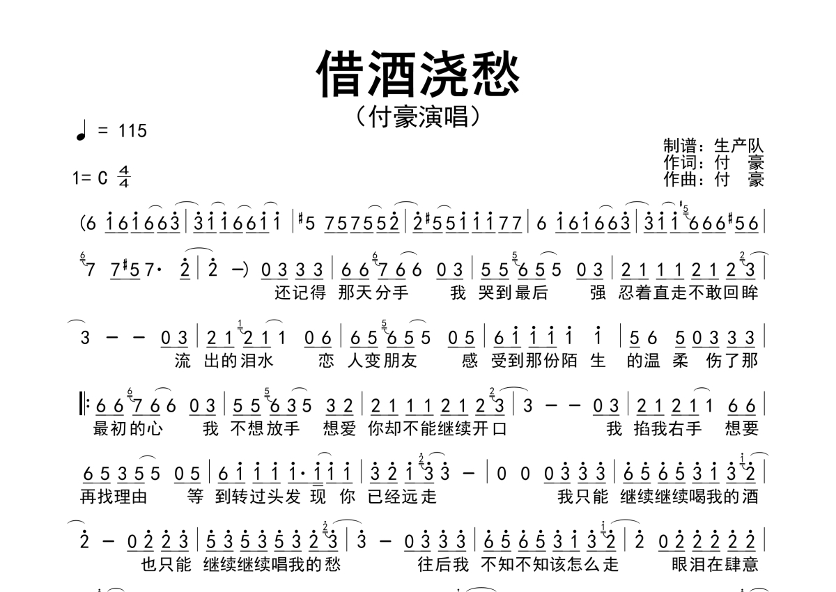 • 借酒浇愁简谱 - 付豪 - 简谱第1张