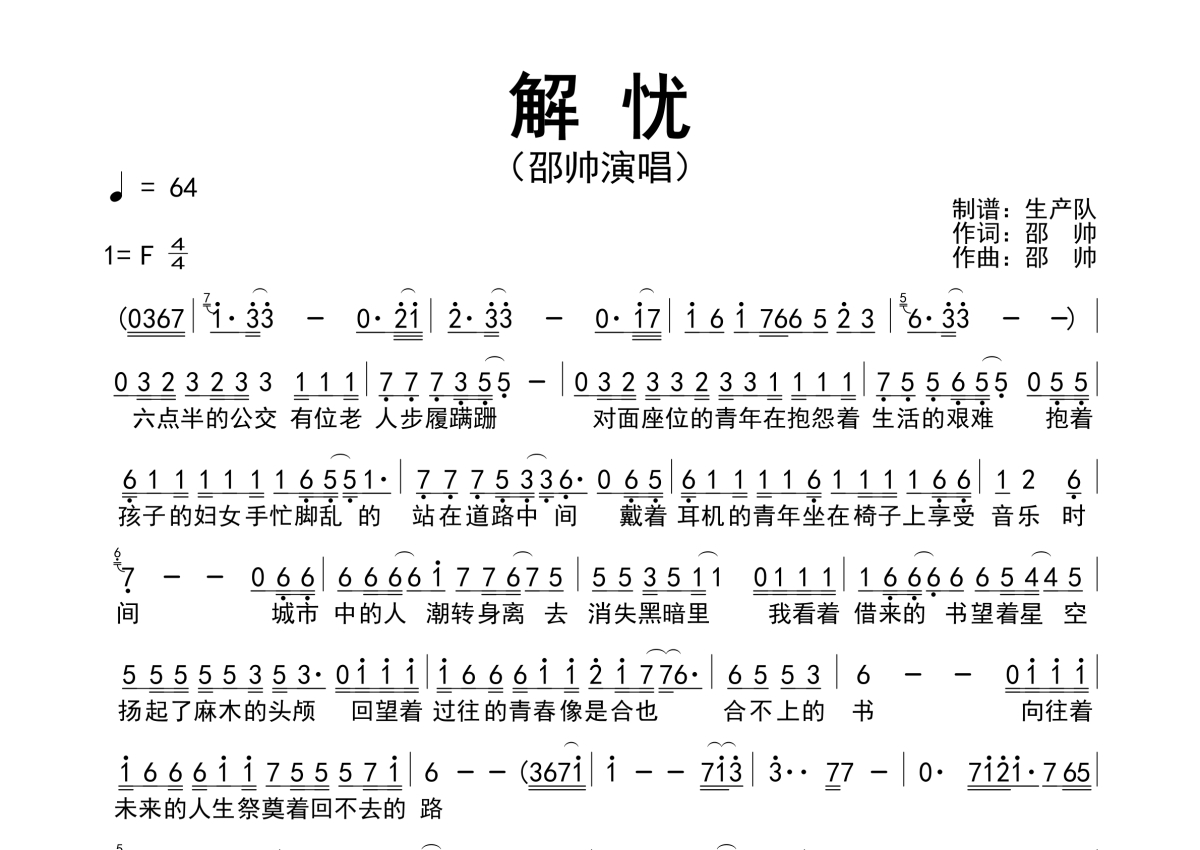 曲谱介绍: 解忧邵帅《解忧》简谱,生产队编配出品,共有1张高清图谱,免翻页排版设计。