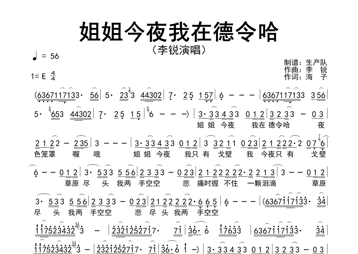 曲谱介绍: 李锐《姐姐今夜我在德令哈》简谱,生产队编配出品,共有1张高清图谱,免翻页排版设计。