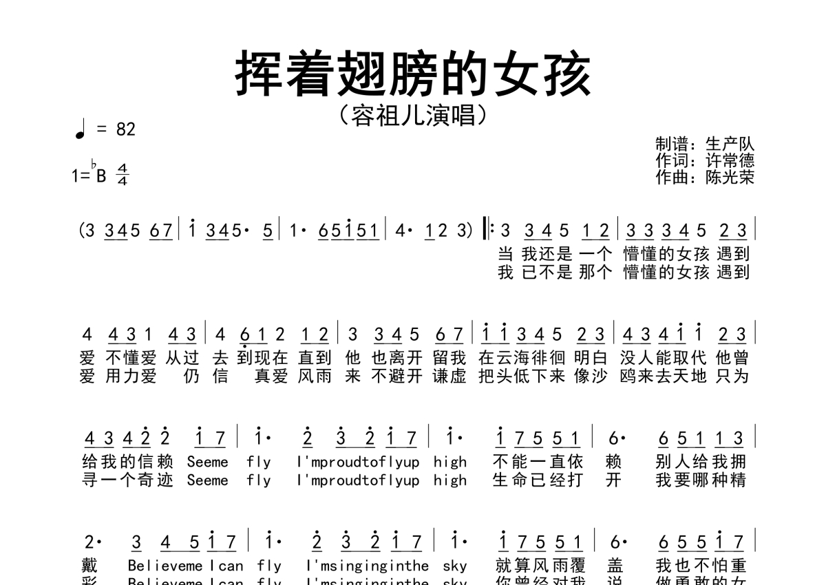 曲谱介绍: 容祖儿《挥着翅膀的女孩》简谱,生产队编配出品,共有1张高清图谱,免翻页排版设计。