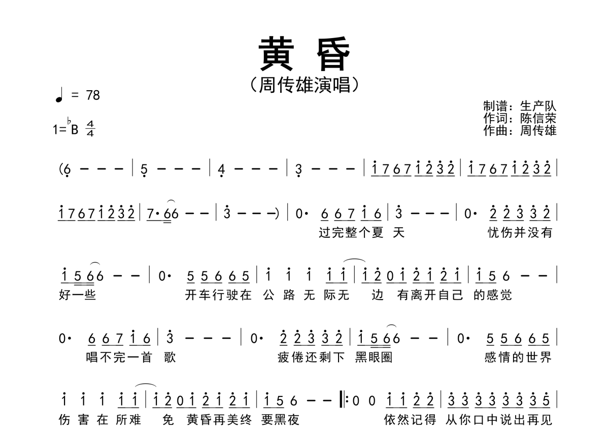 曲谱介绍: 周传雄《黄昏》简谱,生产队编配出品,共有1张高清图谱,免翻页排版设计。