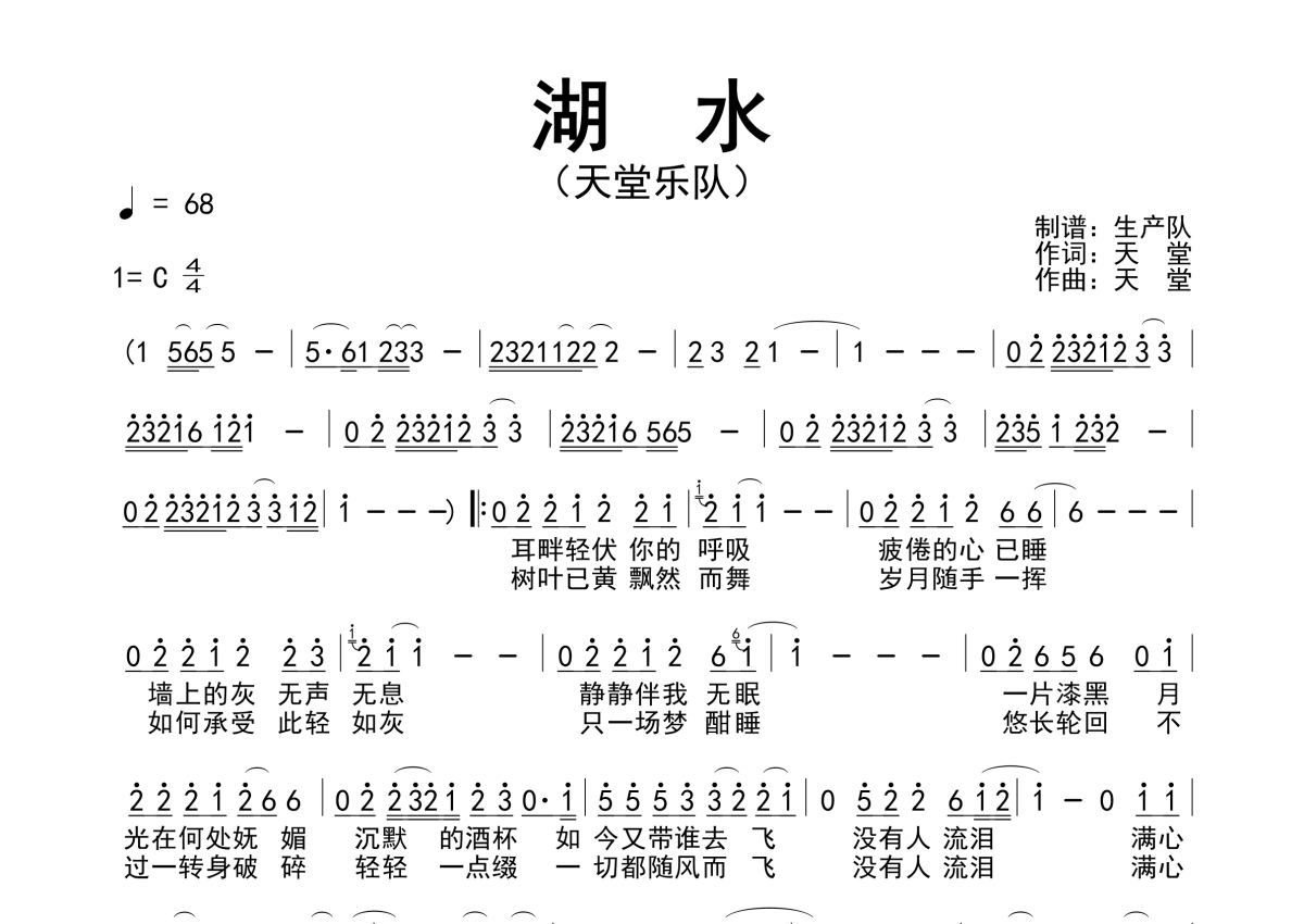 曲谱介绍: 天堂乐队《湖水》简谱,生产队编配出品,共有1张高清图谱,免翻页排版设计。