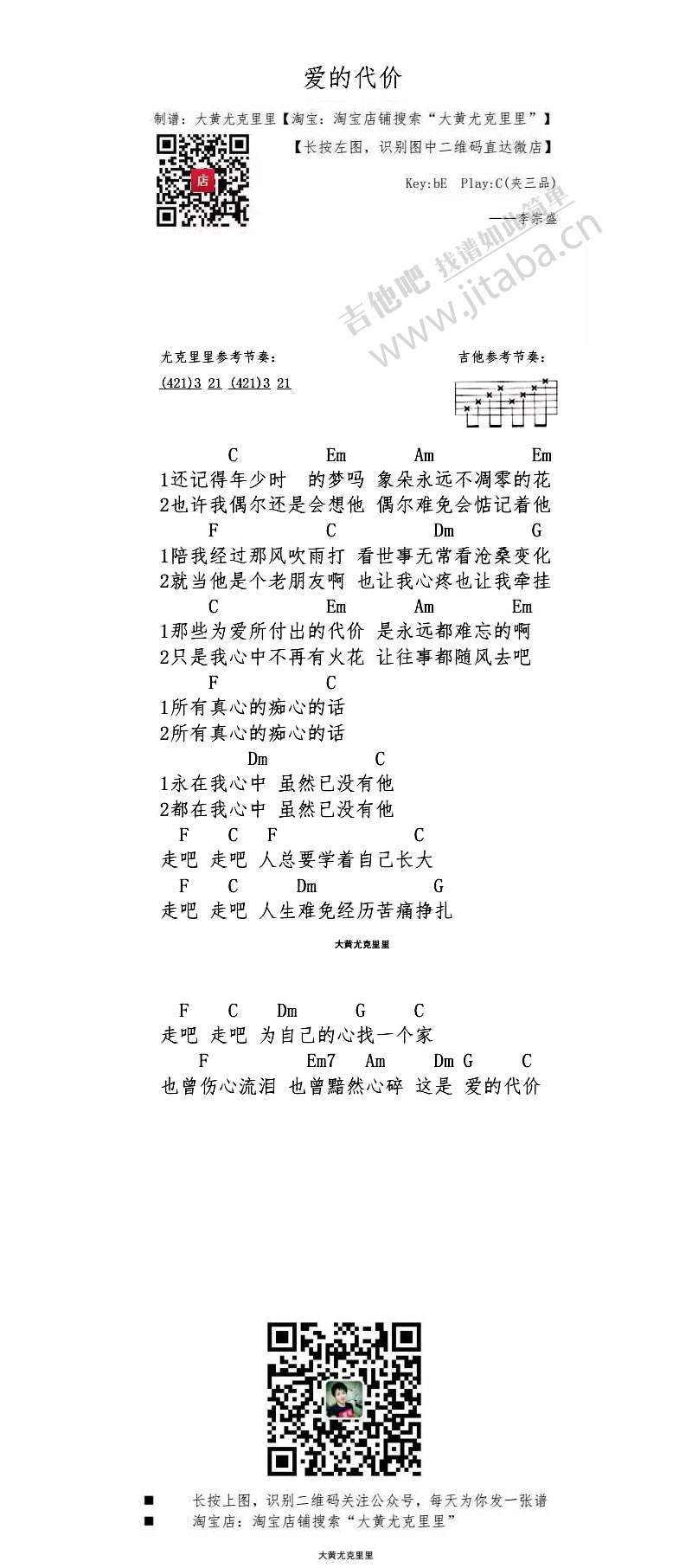 曲谱介绍: 爱的代价尤克里里谱,原调: bE 选用:C调指法,变调夹夹三品 尤克里里参考节奏: 吉他参考节奏: (421)321(421)321C EmAm Em 1还记得年少时的梦吗象朵永远不凋零的花 2也许我偶尔还是会想他偶尔难免会惦记着他 FC DnG 1陪我经过那风吹雨打看世事无常看沧桑变化 2就当他是个老朋友啊也让我心疼也让我牵挂 CE Am Em 1那些为爱所付出的代价是永远都难忘的啊 2只是我心中不再有火花让往事都随风去吧 FC 1所有真心的痴心的话 2所有真心的痴心的话 DIC 1永在我心中虽然已没有他 2都在我心中虽然已没有他 FCFC 走吧走吧人总要学着自己长大 F C DmG 走吧走吧人生难免经历苦痛挣扎 大黄尤克里里 走吧走吧为自己的心找一个家 F Em7 Am DmGC 也曾伤心流泪也曾黯然心碎这是爱的代价他谱和弦运用简单, 曲子旋律顺耳,合理,叫人沉醉 的进行随意歌的感情意境搭配就好 喜欢的网友可以弹奏 100jita.com制谱