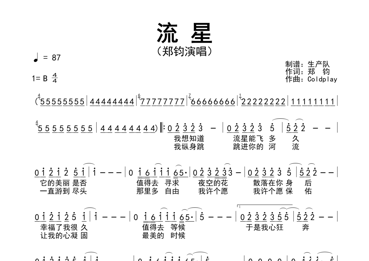 曲谱介绍: 郑钧《流星》,生产队编配出品,共有1张高清图谱,免翻页排版设计。