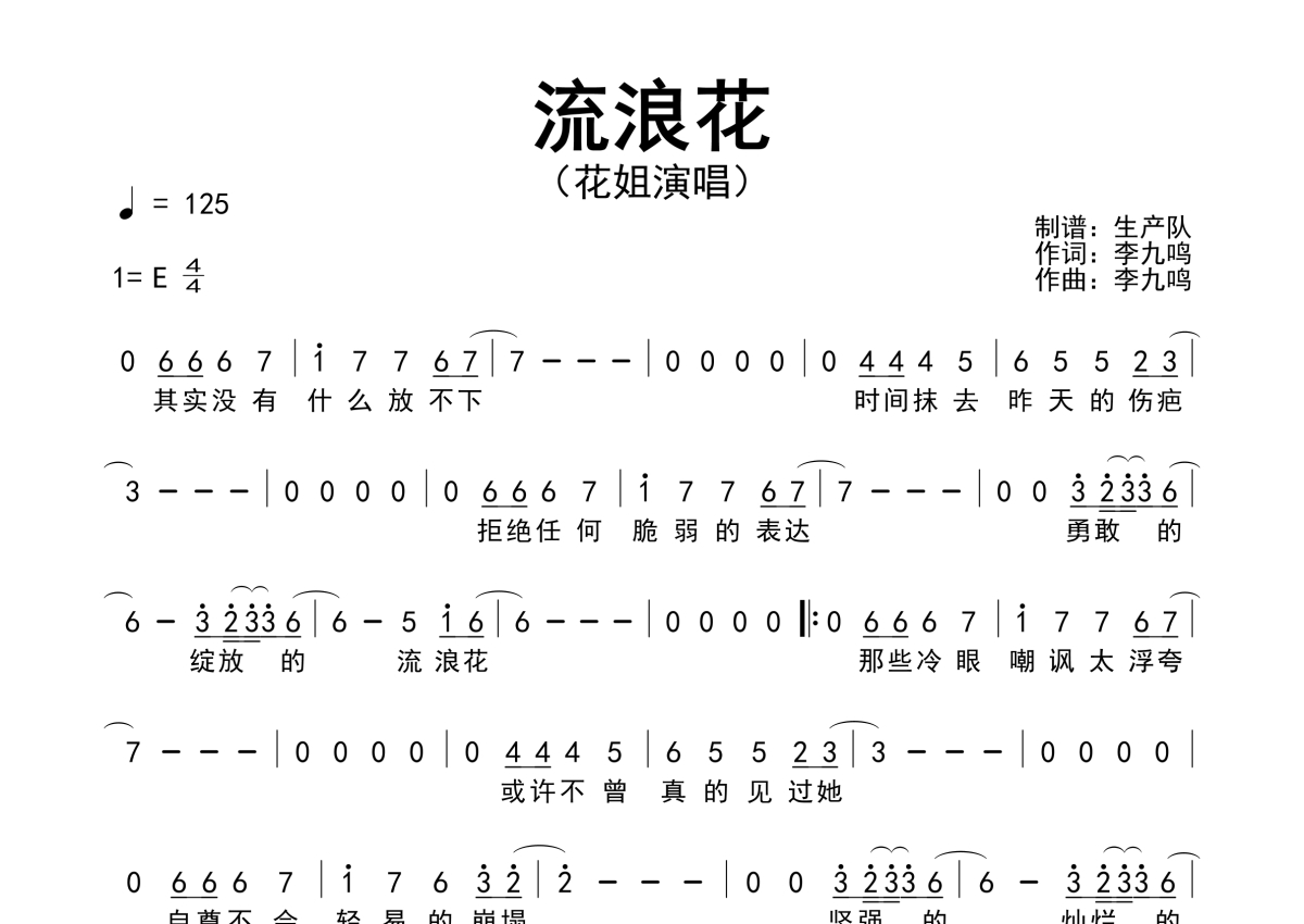 曲谱介绍: 花姐《流浪花》,生产队编配出品,共有1张高清图谱,免翻页排版设计。