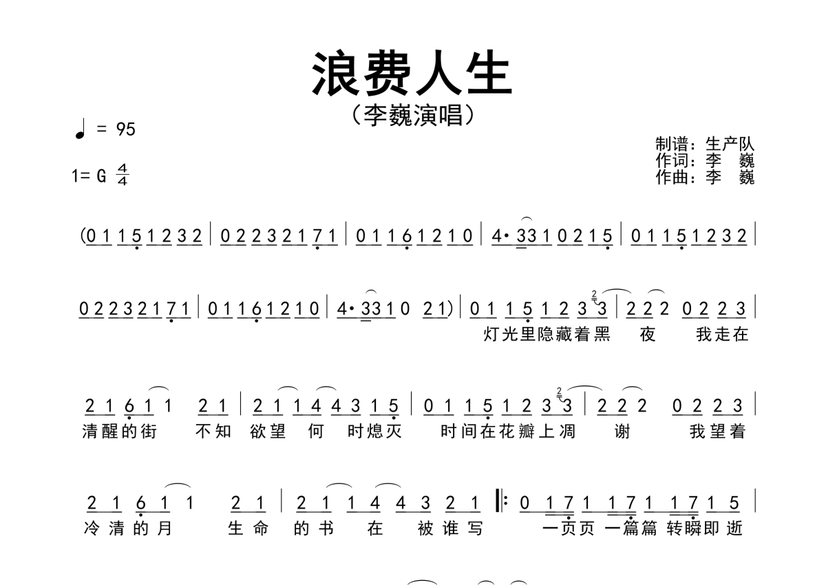 曲谱介绍: 李巍《浪费人生》,生产队编配出品,共有1张高清图谱,免翻页排版设计。