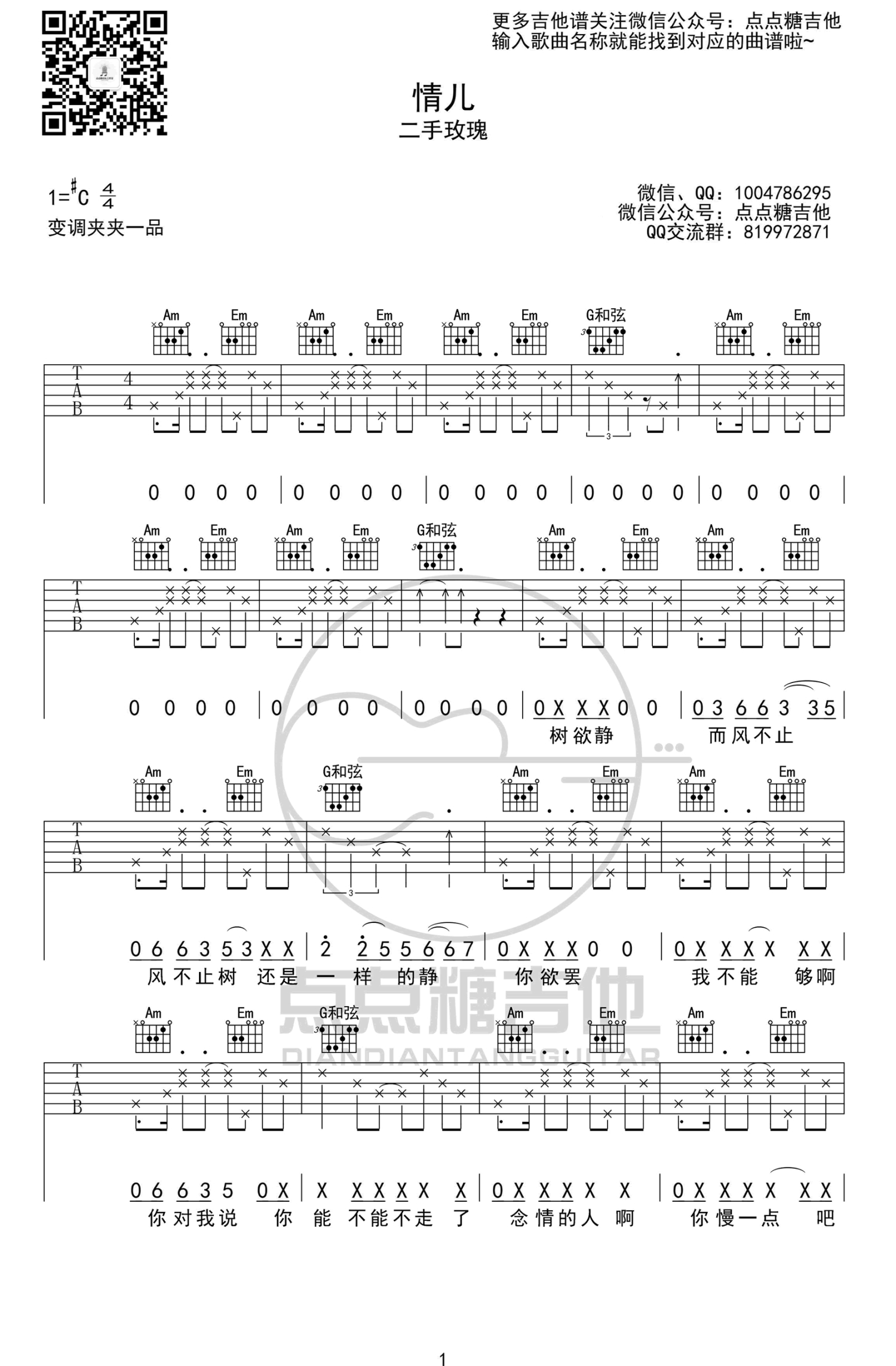 曲谱介绍: 二手玫瑰《情儿》吉他谱,这首歌原唱是二手玫瑰,是C调,老师扒的是视频里那位小姐姐弹唱的版本,她的变调夹夹的是一品,也就是比C调高一个半音的#C调,所以在谱子上我也标注了变调夹夹1品。副歌部分有4/4拍和2/4拍的切换,这里稍微注意一下;在第二页倒数第二排的第三、四个小节的小节线上分别都有一个(x4)的标注,这个标注表示那个小节要重复弹奏四遍。整首歌基本都是Am、Em在来回切换,而难点在于Am那里的顿音,建议观看视频、结合谱例来学习。