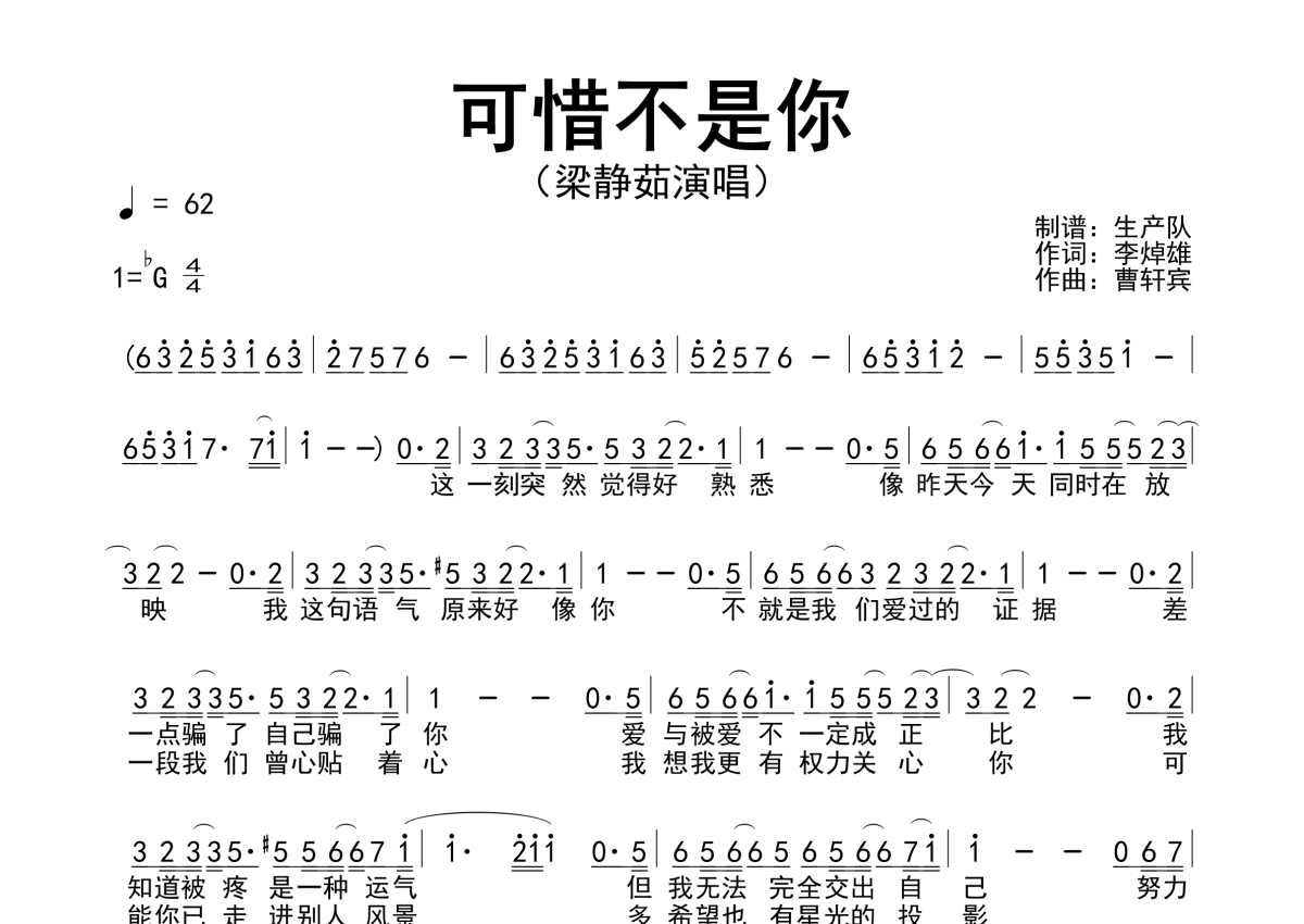 曲谱介绍: 梁静茹《可惜不是你》,生产队编配出品,共有1张高清图谱,免翻页排版设计。