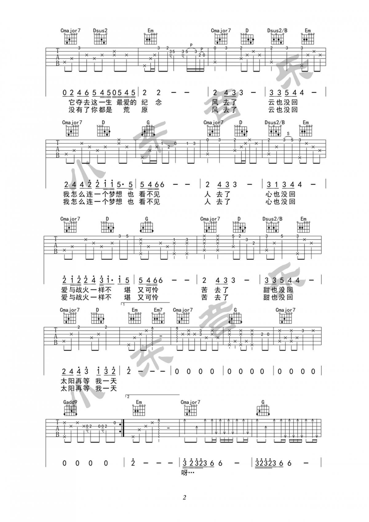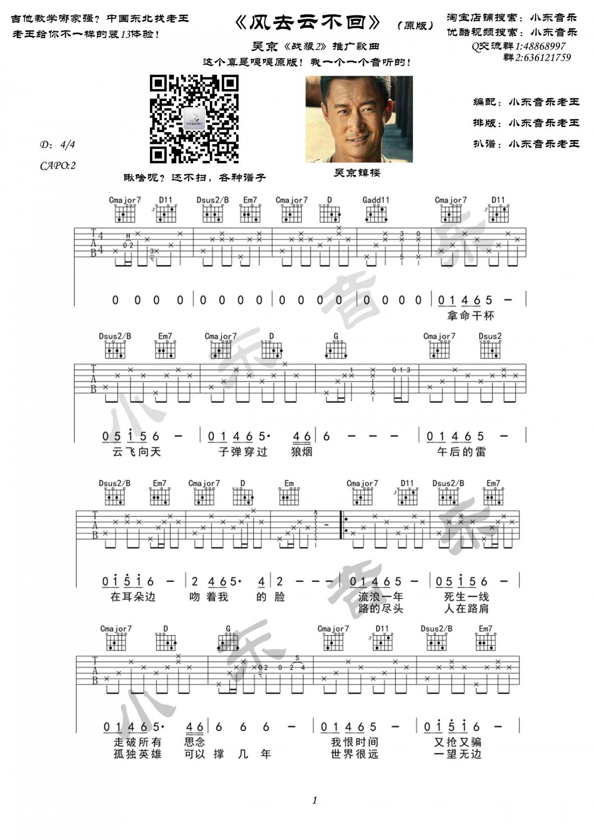 曲谱介绍: 吴京《风去云不回》吉他弹唱谱,采用B调指法编配,共有3张高清图谱。