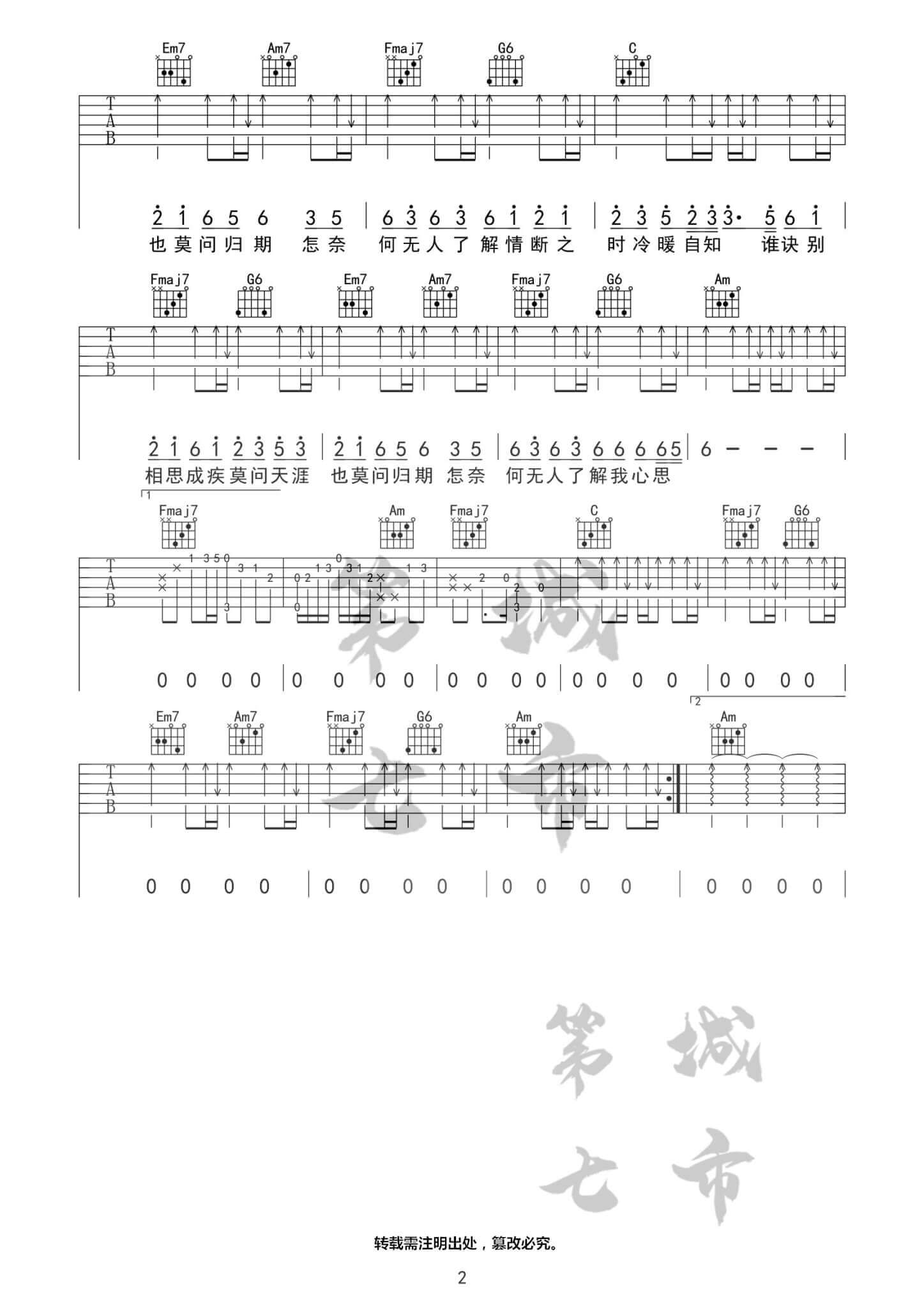 曲谱介绍: 本曲谱由第七城市编配制作,曲谱选用C调和弦,变调夹4品,适合进阶的吉他玩家。《莫问归期》是由蒋雪儿演唱的歌曲,这是一首极具古风韵味的歌曲将传统的曲艺风格和现代流行音乐的节奏相结合,在西洋乐器和民族乐器的结合中寻找最佳的融合点,用自己独特的嗓音唱出相思之苦。