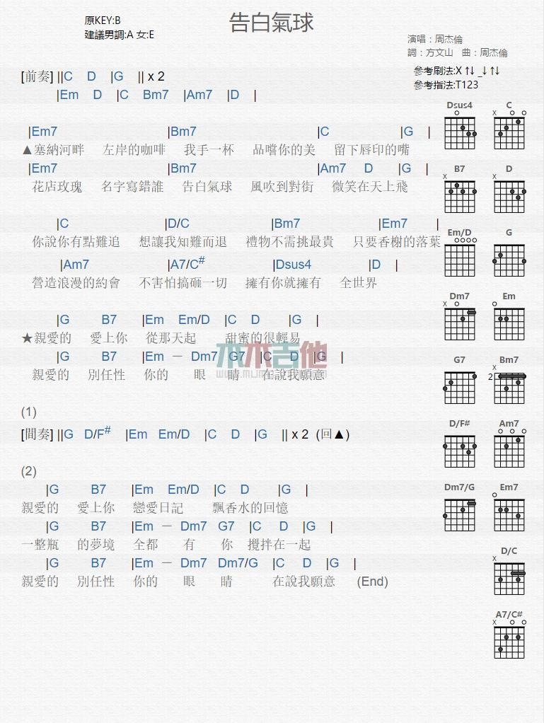 曲谱介绍: 周杰伦告白气球吉他谱,告白气球吉他谱。吉他半色调,六线音乐安排,高清晰度的画面配乐,周杰伦最新专辑睡前故事中最浪漫的通告和最甜美的歌曲之一。由周杰伦的歌词方文山创作。周杰伦情歌的经典风格。