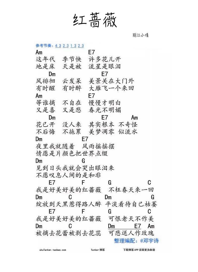 曲谱介绍: 《红蔷薇》尤克里里谱、吉他谱。丽江小倩演唱的民谣,她的每个作品都汇集了她自己的真实情感,平淡质朴的旋律和柔美的歌声,歌颂了红蔷薇那,春光、风雨的精神。丽江小倩每首歌曲的创作都有独特的创作背景,从而能让听众读懂每首歌曲的背后故事,更能引起共鸣。这首是尤克里里谱,不过相同的和弦搭配同样也适合吉他弹奏。喜欢这首歌曲的朋友记得收藏哦,100吉他编辑整理。