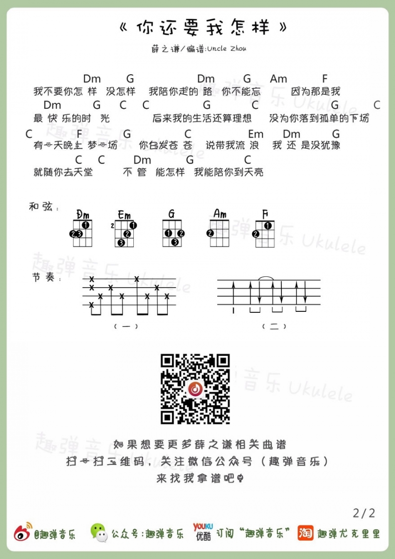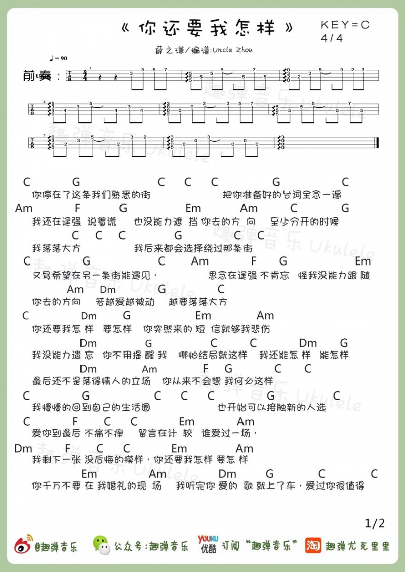曲谱介绍: 你还要我怎样尤克里里谱,两张图片尤克里里谱。细腻的歌词和柔美的旋律唱出了,薛之谦爱情中的感受。使人泪目,歌声冷冷的色调,沁人心脾。他总能唱出感情世界里的触人心弦的伤感歌曲。此歌曲是尤克里里谱,吉他爱好者也可弹奏,只要和弦弹对就可以了。琴谱网收集整理#