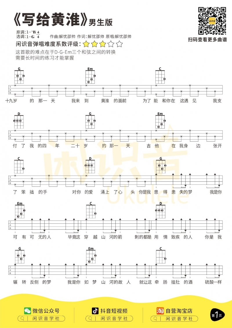 曲谱介绍: 男生版《写给黄淮》,共有3张高清图谱。