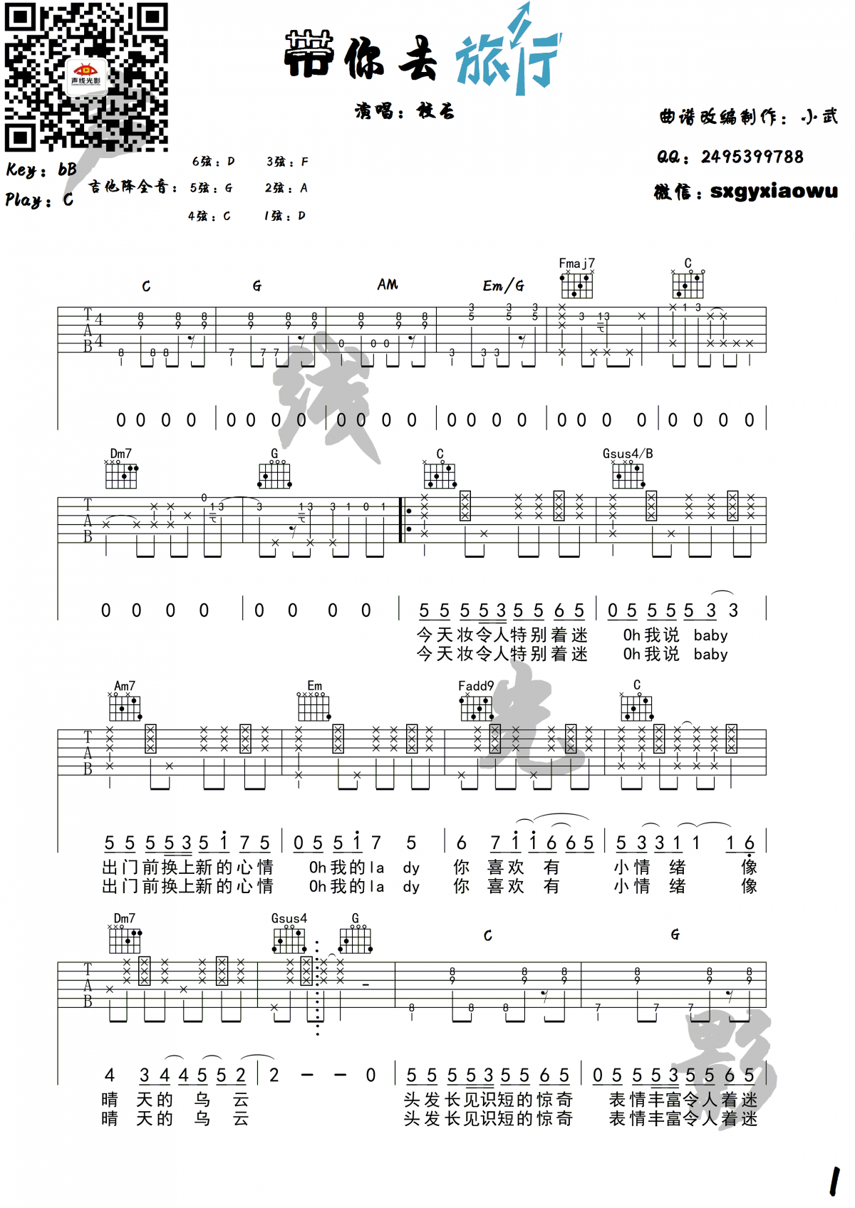曲谱介绍: 带你去旅行吉他谱,带你去旅行吉他六线谱,采用C调指法。校长演唱了一首流行的网络歌曲,四张高清图片评分,歌曲速度115拍/分钟,注意编纂使用大量低音伴奏,大拇指低音有一定的要求,需要更多的练习。技能G需要大量的练习才能玩得清楚,请把这部分拿出来单独练习。感谢您编写深蓝雨吉他,并将音乐演示和吉他教学视频带给玩家。