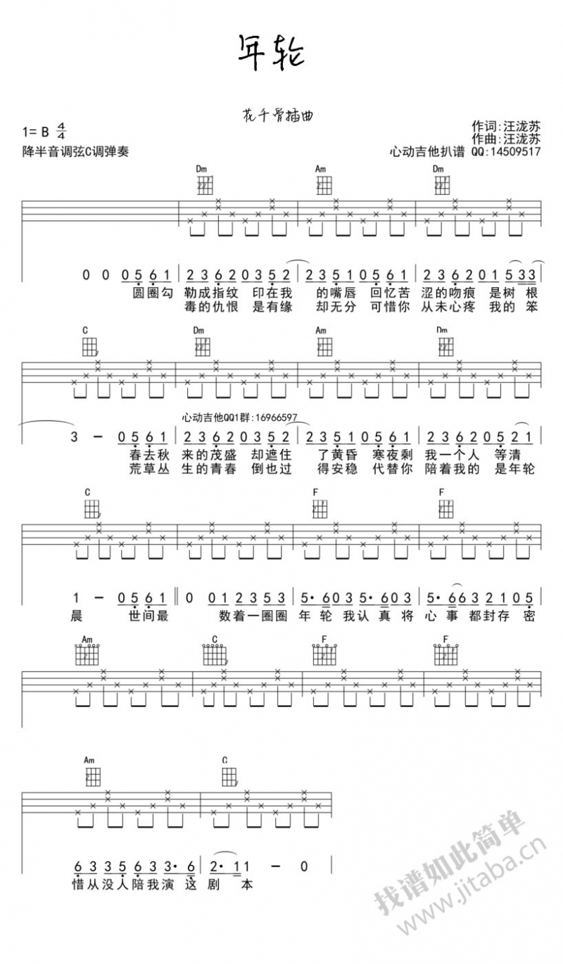 曲谱介绍: 年轮尤克里里谱,降半音调弦C调弹奏 花千骨插曲 1=b4 作词:汪泷苏 作曲:汪泷苏 的嘴唇回忆苦涩的吻痕是树根 圆圈勾勒成指纹印在我 毒的仇恨是有缘却无分可惜你从未心疼我的笨 CD Anm 春去秋来的茂盛却遮住了黄昏寒夜剩我一个人等清 荒草丛生的青春倒也过得安稳代替你陪着我的是年轮 FF 丗 1-· 晨世间最数着一圈圈年轮我认真将心事都封存密 F AmC 惜从没人陪我演这剧本 u'eqefMMM 这首歌是由汪苏泷演唱的一首老歌。 年轮美妙与汪苏泷的完美演绎 走向随意歌曲的感情意境舒服就好 喜欢的网友可以弹唱 100jita.com分享