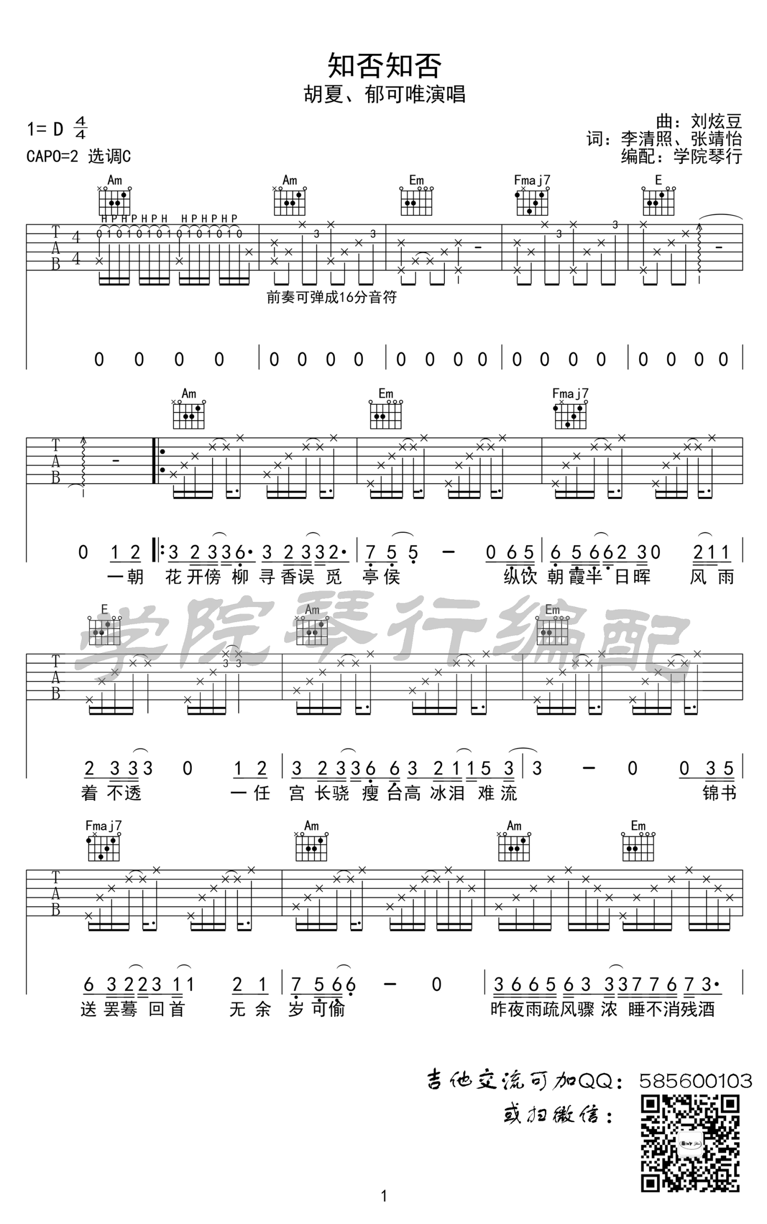 曲谱介绍: 知否知否吉他谱,胡夏郁可唯献唱的一首唯美古风歌曲,热播电视剧《知否知否应是绿肥红瘦》主题曲。知否知否弹唱六线谱,歌曲原调D,CAPO二品,选用C调指法,感谢学院琴行编配出品,打谱啦网上传分享。李清照耳熟能详的经典诗词,被男女声如此深情对唱演绎,一曲终了,道不完人生风雨跌宕起伏,别有一番动人的滋味在心头。