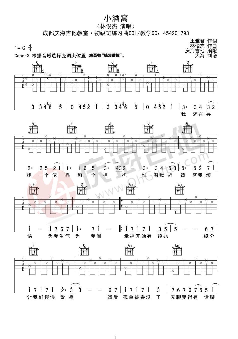 曲谱介绍: 林俊杰《小酒窝》吉他弹唱谱,采用C调指法编配,共有3张高清图谱。