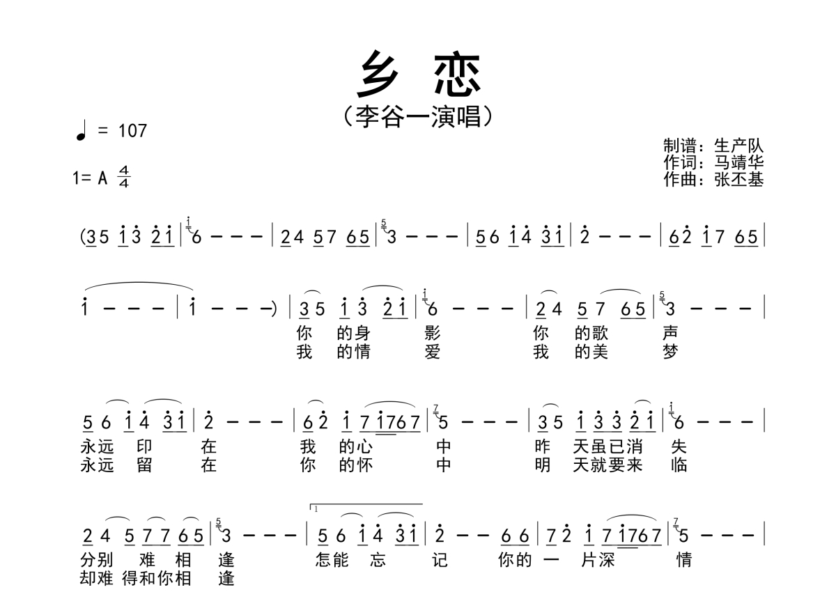 曲谱介绍: 李谷一《乡恋》简谱,生产队编配出品,共有1张高清图谱,免翻页排版设计。