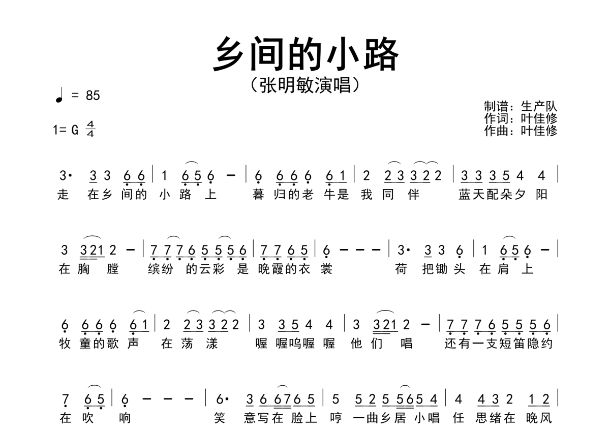 曲谱介绍: 张明敏《乡间的小路》简谱,生产队编配出品,共有1张高清图谱,免翻页排版设计。