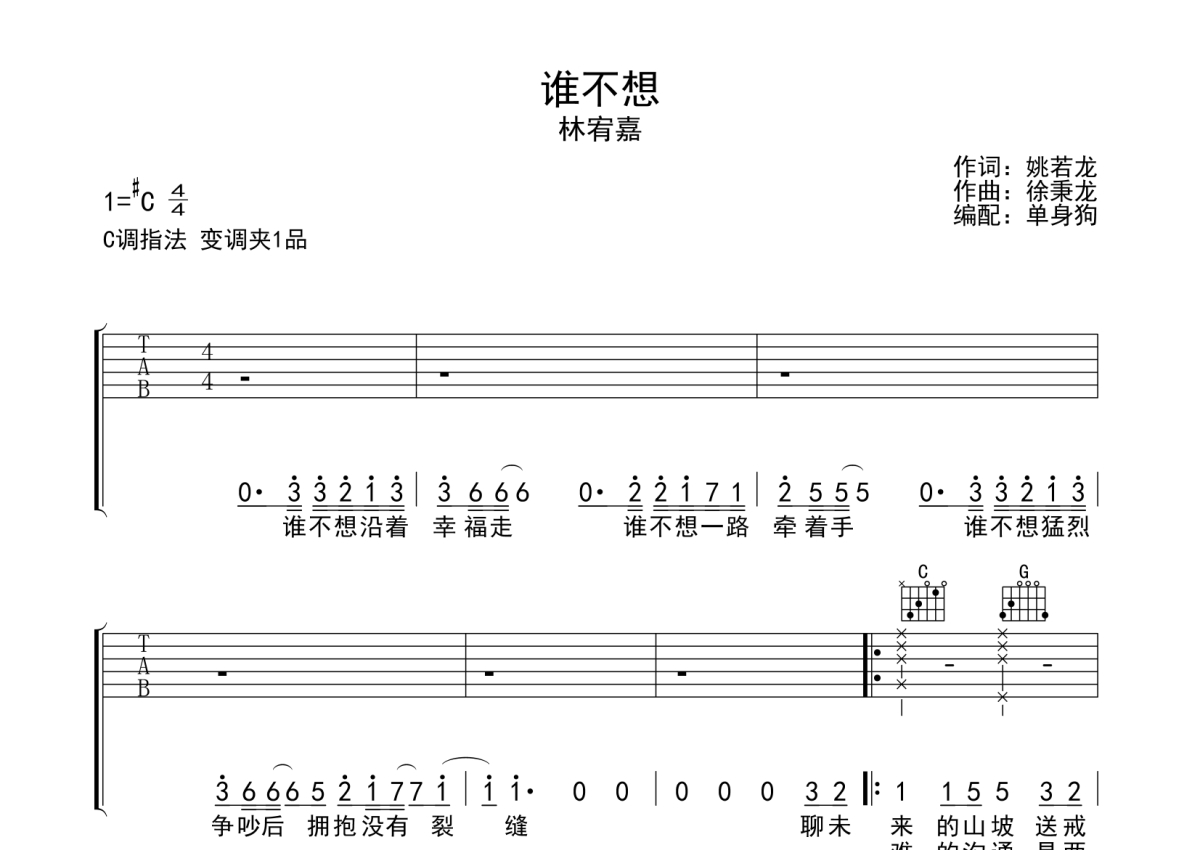 曲谱介绍: 林宥嘉《谁不想》吉他弹唱谱,采用C调指法编配,单身狗编配出品,共有3张高清图谱。