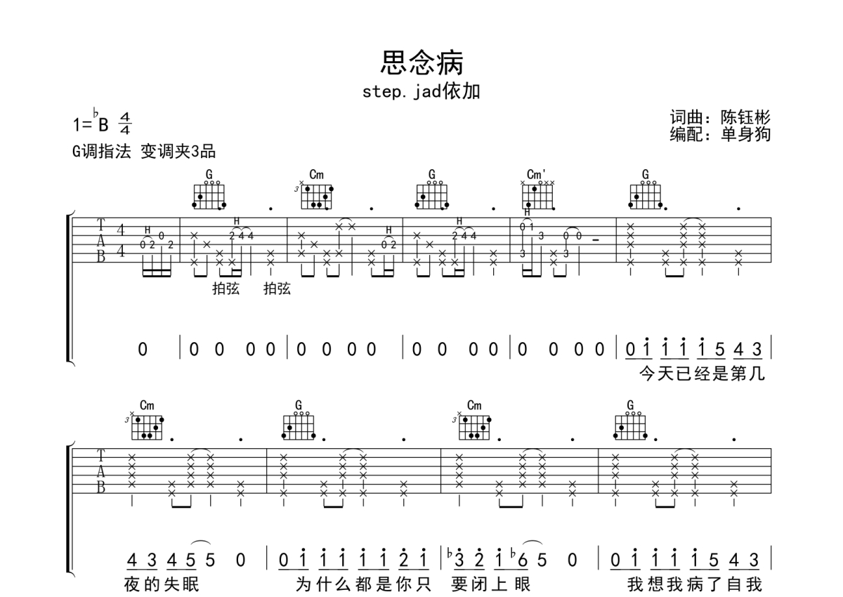 曲谱介绍: step.jad依加《思念病》吉他弹唱谱,采用G调指法编配,单身狗编配出品,共有3张高清图谱。