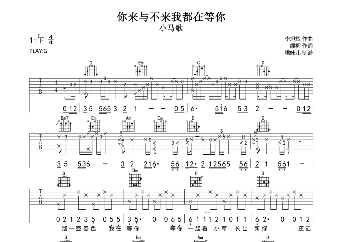 • 你来与不来我都在等你吉他谱 - 小马歌 - G调吉他弹唱谱第1张