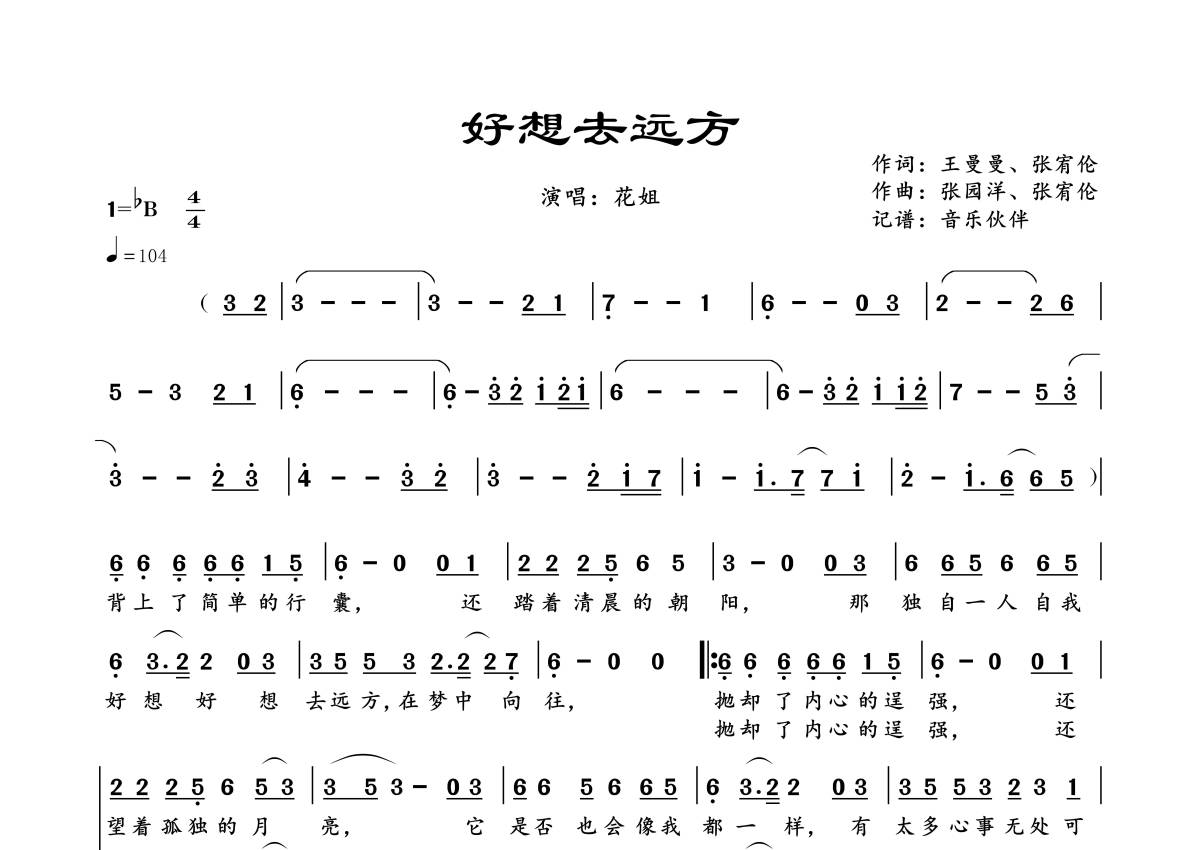曲谱介绍: 花姐《好想去远方》,音乐伙伴编配出品,共有1张高清图谱,免翻页排版设计。
