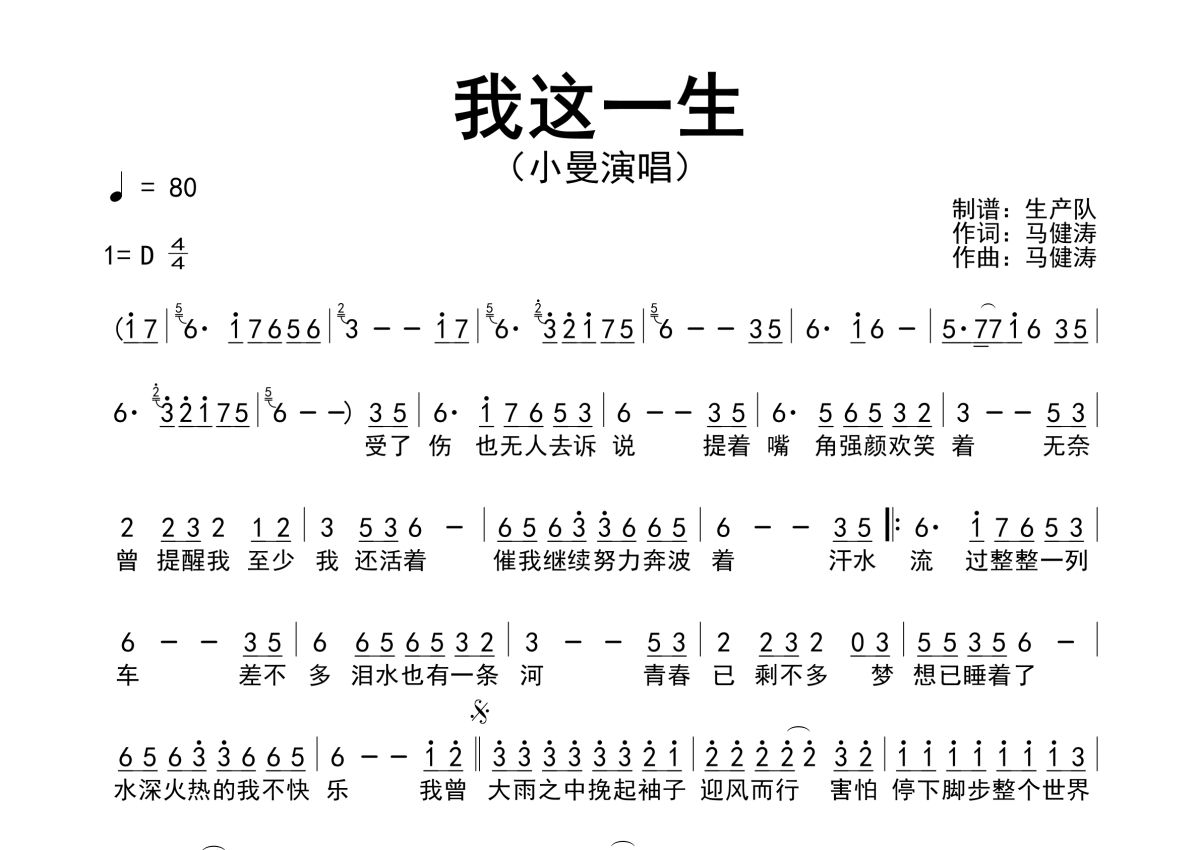曲谱介绍: 小曼《我这一生》简谱,生产队编配出品,共有1张高清图谱,免翻页排版设计。