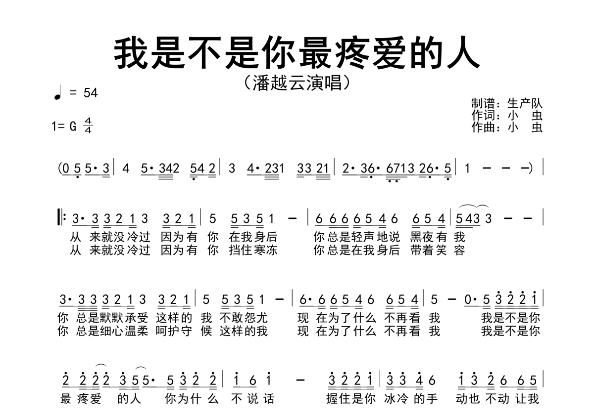曲谱介绍: 潘越云《我是不是你最疼爱的人》简谱,生产队编配出品,共有1张高清图谱,免翻页排版设计。