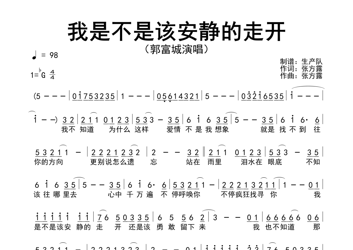 曲谱介绍: 郭富城《我是不是该安静的走开》简谱,生产队编配出品,共有1张高清图谱,免翻页排版设计。