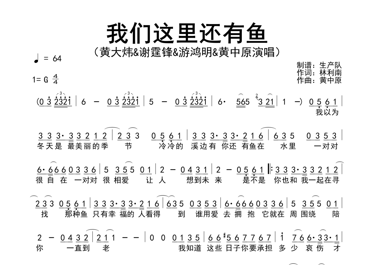 曲谱介绍: 黄中原/黄大炜/游鸿明/谢霆锋《我们这里还有鱼》简谱,生产队编配出品,共有1张高清图谱,免翻页排版设计。