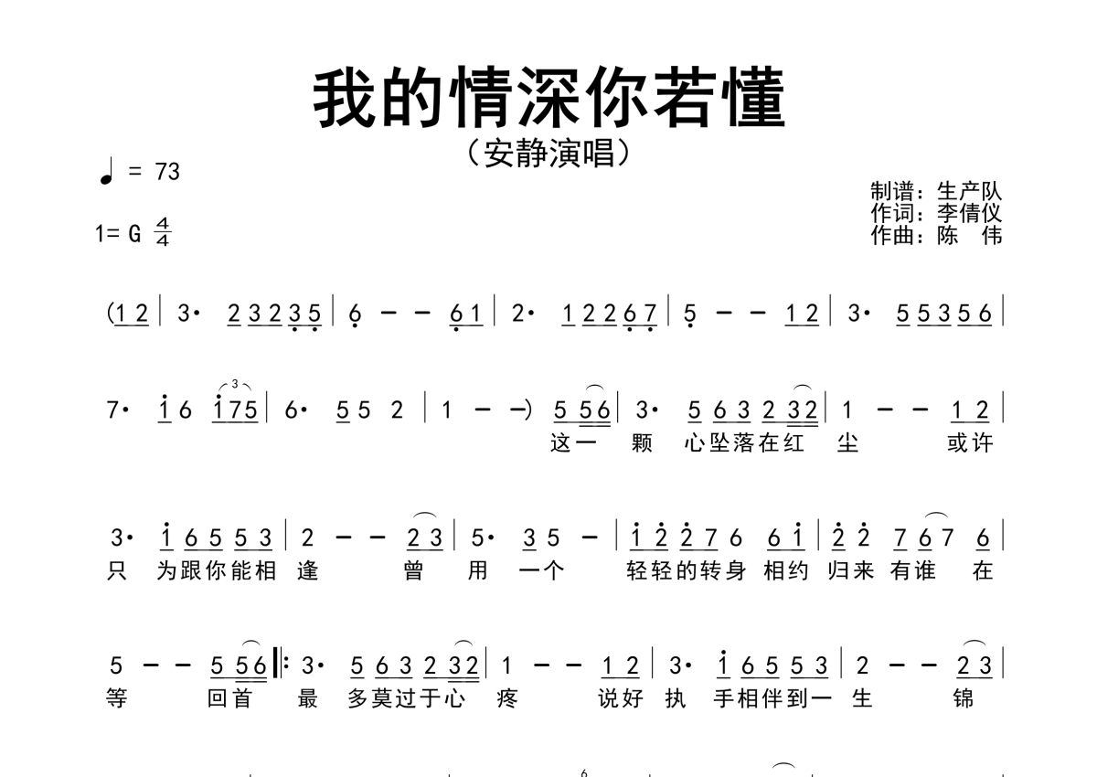 曲谱介绍: 安静《我的情深你若懂》简谱,生产队编配出品,共有1张高清图谱,免翻页排版设计。