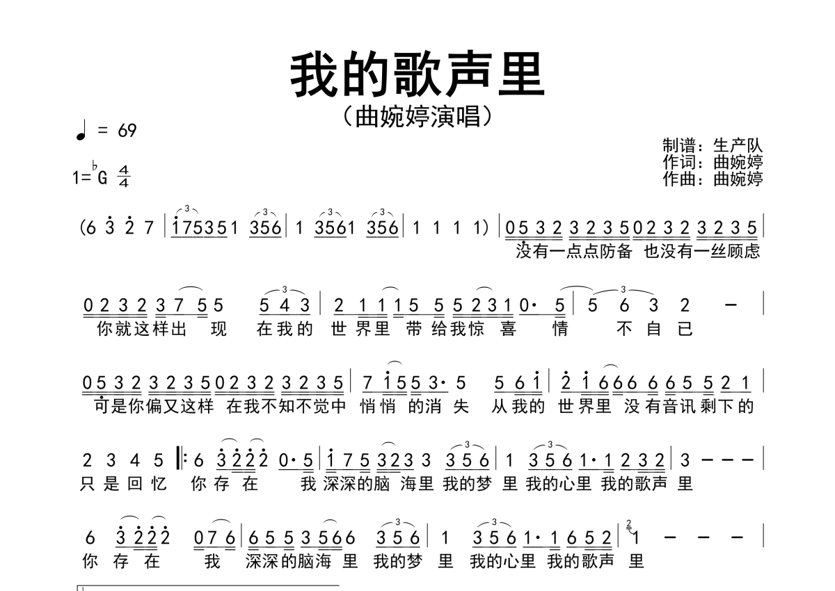 曲谱介绍: 曲婉婷《我的歌声里》简谱,生产队编配出品,共有1张高清图谱,免翻页排版设计。