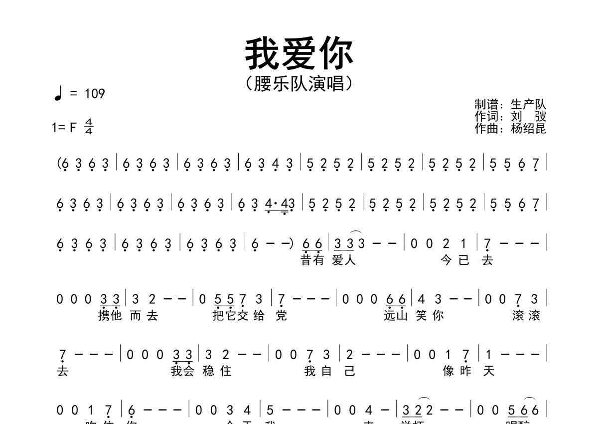 曲谱介绍: 腰乐队《我爱你》简谱,生产队编配出品,共有1张高清图谱,免翻页排版设计。