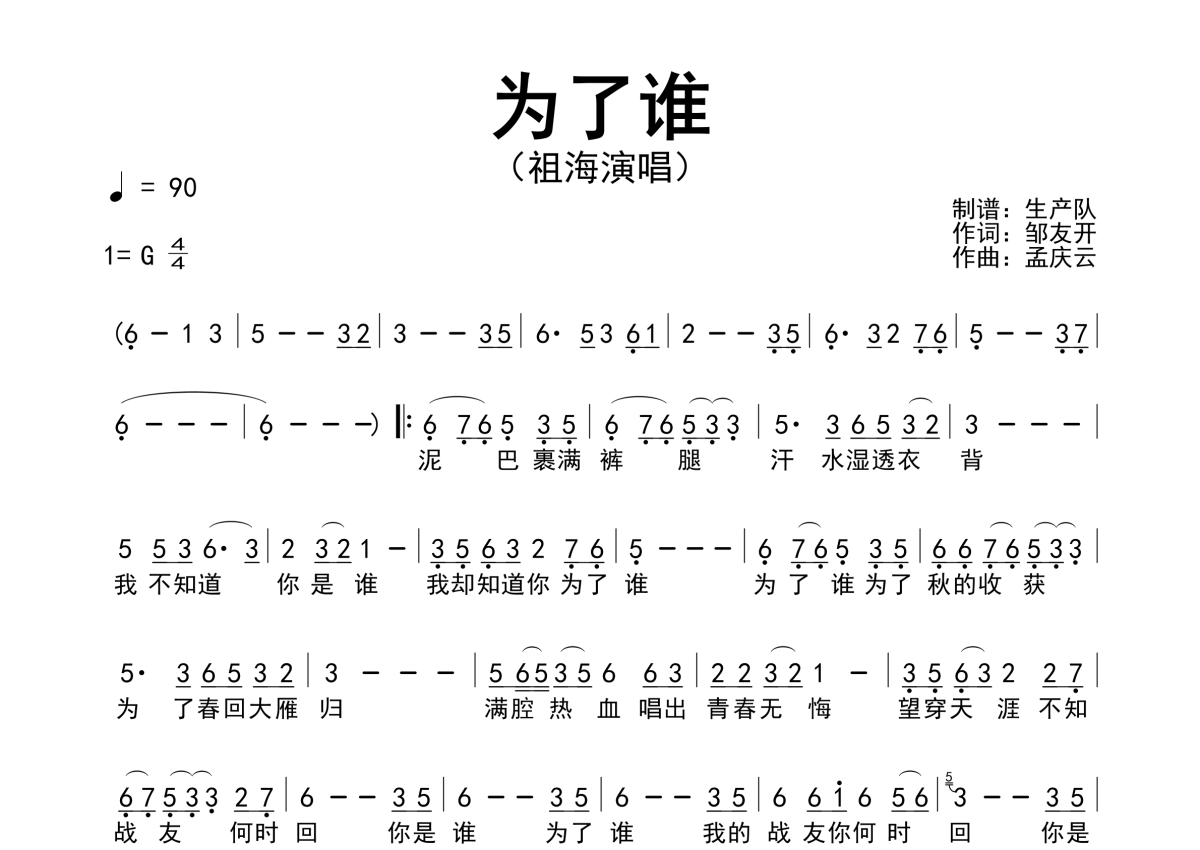 曲谱介绍: 祖海《为了谁》简谱,生产队编配出品,共有1张高清图谱,免翻页排版设计。