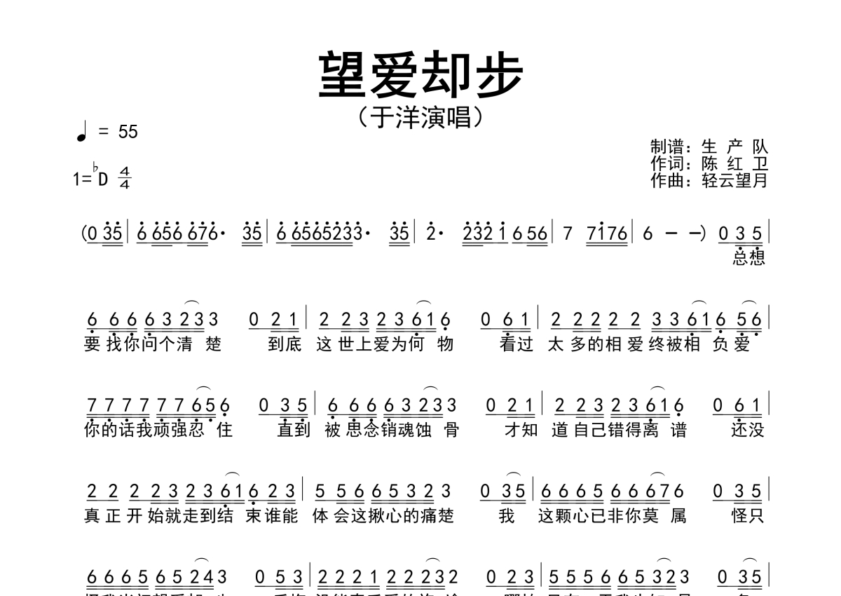 曲谱介绍: 于洋《望爱却步》简谱,生产队编配出品,共有1张高清图谱,免翻页排版设计。