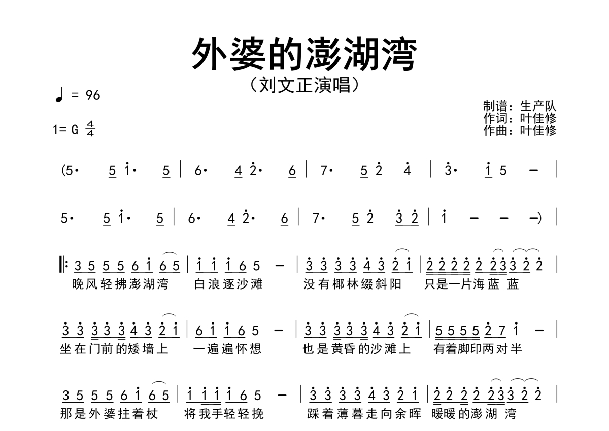 曲谱介绍: 刘文正《外婆的澎湖湾》简谱,生产队编配出品,共有1张高清图谱,免翻页排版设计。