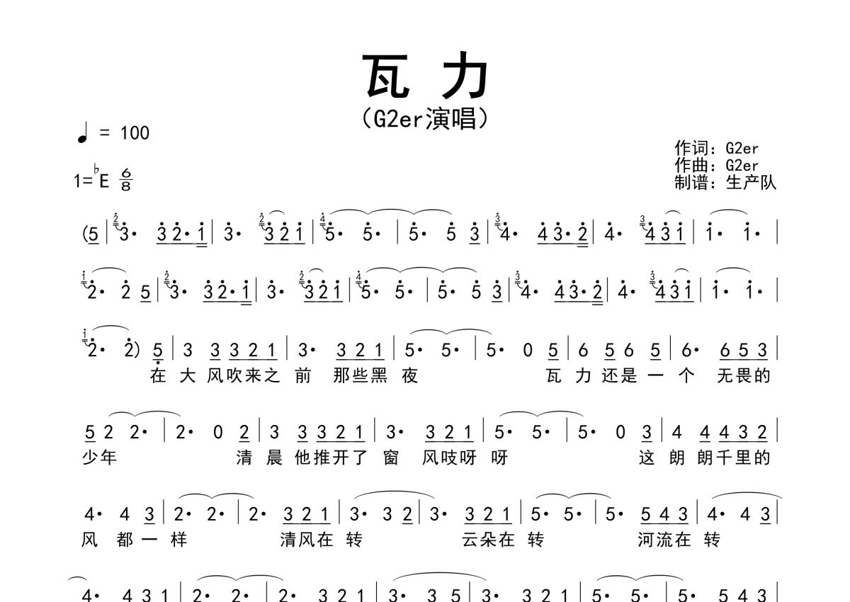 曲谱介绍: G2er《瓦力》简谱,生产队编配出品,共有1张高清图谱,免翻页排版设计。