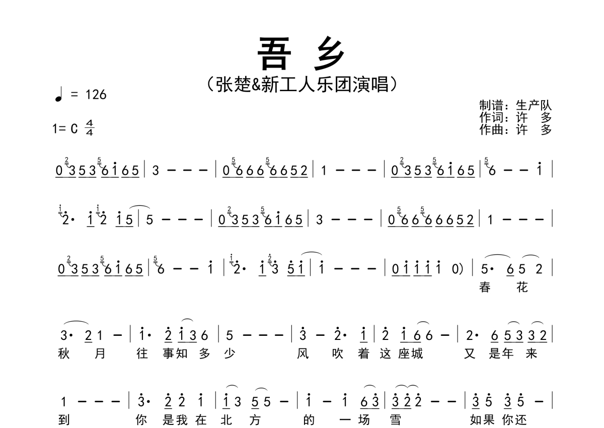 曲谱介绍: 张楚/新工人乐团《吾乡》,生产队编配出品,共有2张高清图谱,免翻页排版设计。