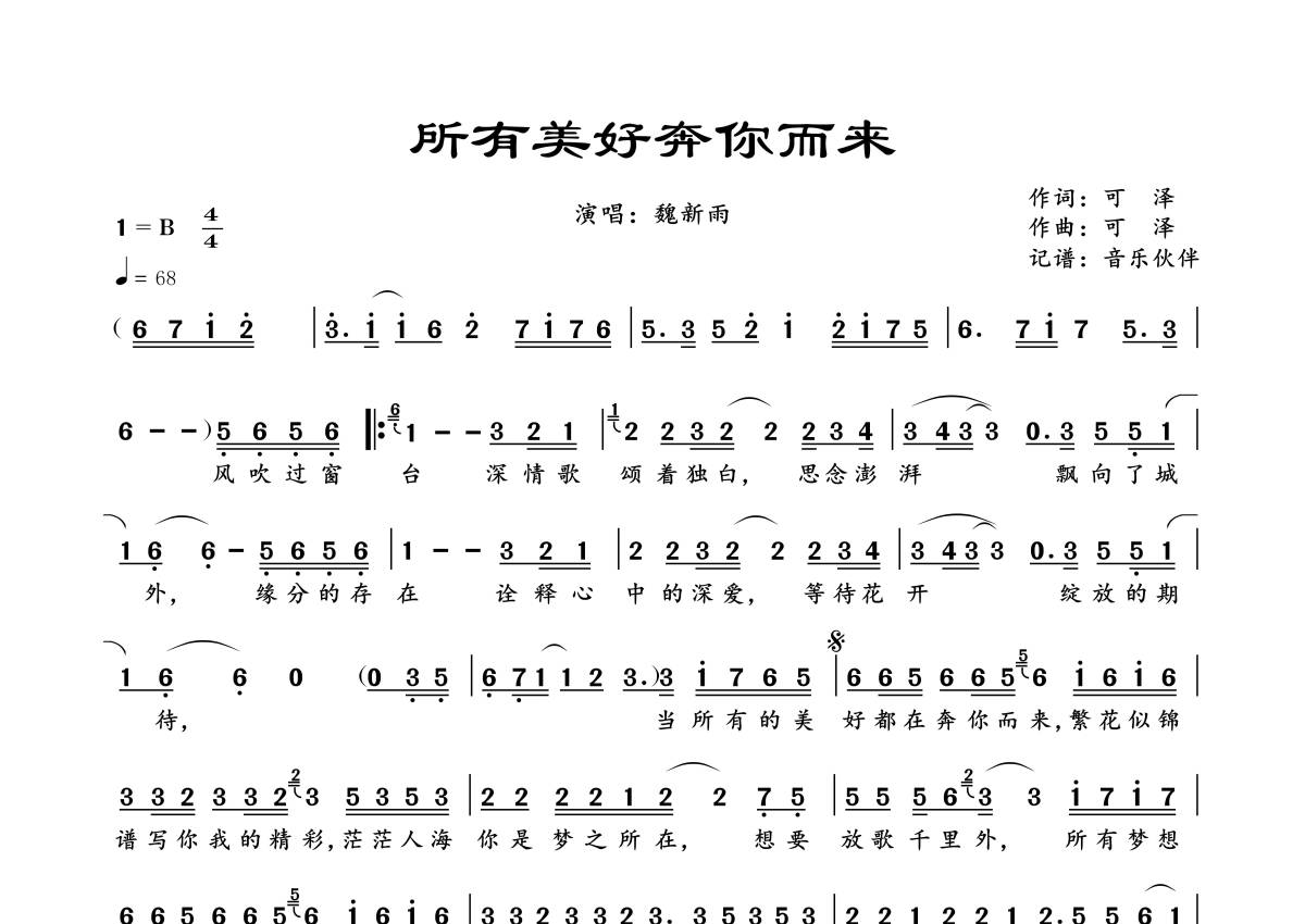 曲谱介绍: 魏新雨《所有美好奔你而来》,音乐伙伴编配出品,共有1张高清图谱,免翻页排版设计。