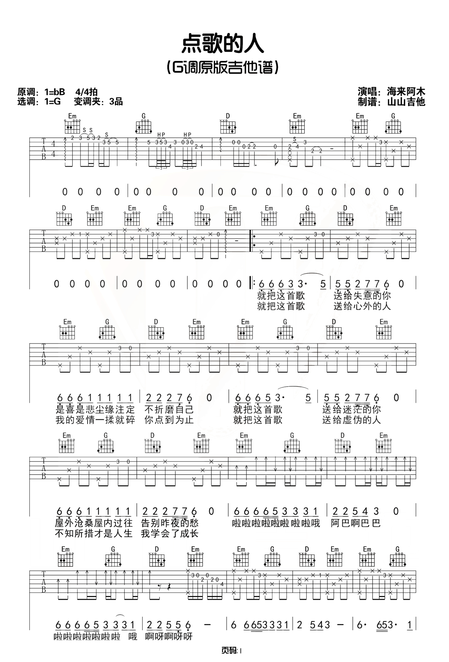 曲谱介绍: 编配有前奏间奏,歌曲原调降B选调G,变调夹夹三品。点歌的人六线谱,最近,抖音上这首《点歌的人》火了,这首歌是由四川彝族歌手海来阿木演唱的原创歌曲,歌词虽然不多,但是唱出了很多心酸过往,喜欢这首歌的朋友们可以拿起吉他谱练起来啦~