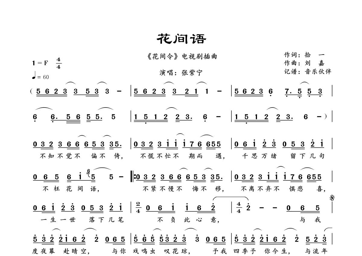 曲谱介绍: 张紫宁《花间语》,音乐伙伴编配出品,共有1张高清图谱,免翻页排版设计。