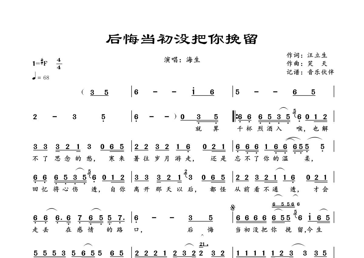 曲谱介绍: 海生《后悔当初没把你挽留》,音乐伙伴编配出品,共有1张高清图谱,免翻页排版设计。