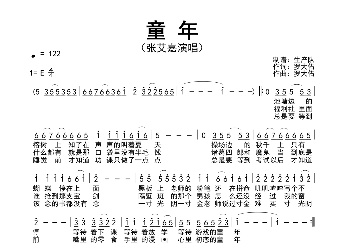 曲谱介绍: 张艾嘉《童年》简谱,生产队编配出品,共有1张高清图谱,免翻页排版设计。
